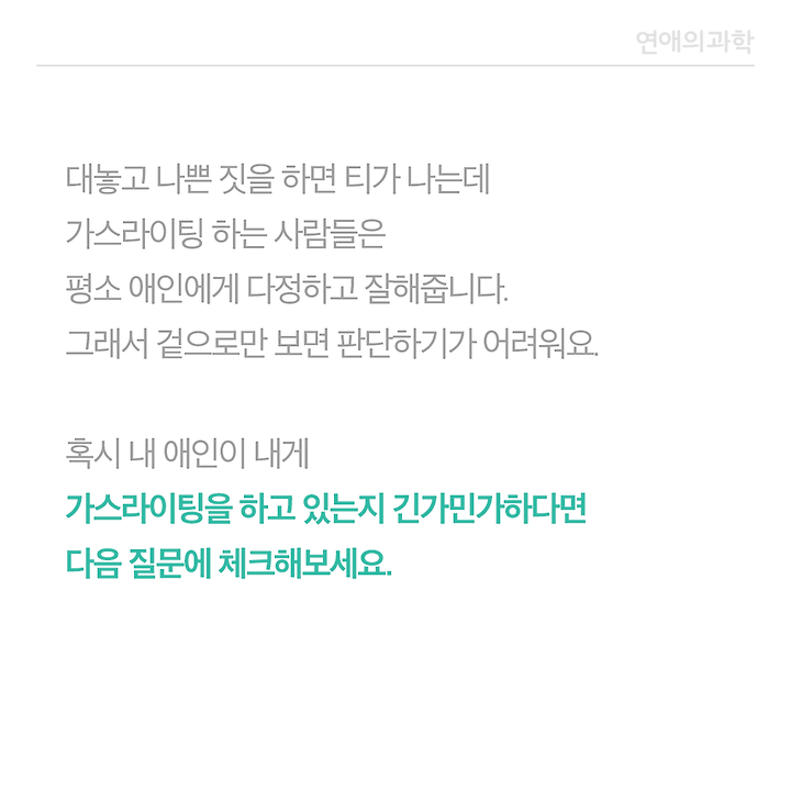 가스라이팅 연애 : ê°ì¤ë¼ì´í ì´ ëì§ ì ì ìë ëí ìì ì¤íì´ ì¹´í ê³ ë¦¬ / 심리적으로 잠식을 시켜버리는, 가스라이팅에 대한 질문들이 간혹 한 번씩 있어서.